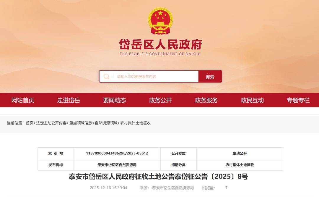 12月16日,岱岳区东谈主民政府网站发布泰安市岱岳区东谈主民政府征收地盘公告泰岱征公告〔2025〕8号,细目如下: