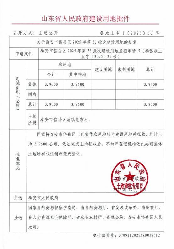山东省东谈主民政府以《对于泰安市岱岳区2025年第36批次诞生用地的批复》(鲁政土字J〔2025〕56号)批准征收地盘3.96公顷(本公告附件).